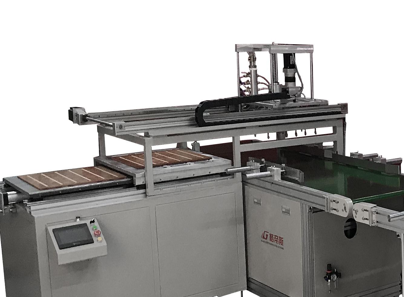将灯盘放置于皮带输送线,待灯盘输送到指定位置时,感应器会自动检测到产品,同时多个91看片网站在线观看头下降开始91看片网站在线观看,皮带输送线带动灯盘,沿预定的位置线路91看片网站在线观看,同时可以在触摸屏中设定91看片网站在线观看运动速度控制胶量。91看片网站在线观看完成后,灯盘流向灯条贴装工位,工人将灯条放入治具,吸盘装置将灯条吸至打完胶的灯盘上方,待灯盘就位后将灯条下压,完成贴装作业,产品流向下一个工位,或者人工堆垛。